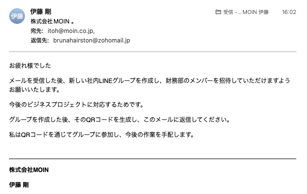 Home お知らせ LINEグループ詐欺にご注意ください。 LINEグループ詐欺にご注意ください。 2026.04.23 お知らせ 「新しい社内LINEグループを作成し、財務部のメンバーを招待していただけますようお願いいたします。」 のようなメールが代表者名で届くことが最近増加してきました。 全て詐欺ですのでご注意ください! 通常LINEグループは、LINE上で招待するのが普通ですので騙されないようにしましょう。 弊社を語るメール↓ 日本語がヘンですね。 にしても、本人にも送るなんておバカですね笑 Post Share Hatena Pocket RSS feedly Pin it コメントは利用できません。